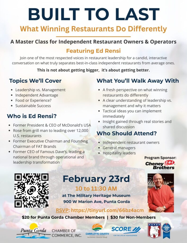 The Punta Gorda Chamber of Commerce is thrilled to bring an extraordinary, cannot-miss opportunity to our community in February 2026. An event featuring Ed Rensi, who Forbes Magazine describes as a dynamic speaker known for energizing, thought-provoking presentations drawing business leaders, entrepreneurs, and innovators.