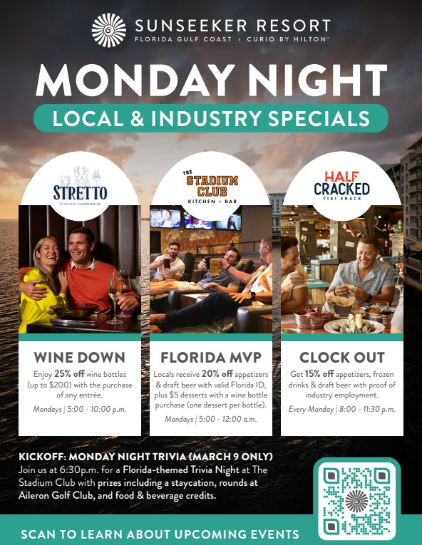 Charlotte County Economic Development highlighted events at Sunseeker Resort, reinforcing the importance of quality of place in economic development strategy. Destination assets and event programming contribute to tourism, workforce attraction, and business visibility. High-quality experiences like these strengthen Charlotte County’s appeal to both visitors and potential residents considering relocation.