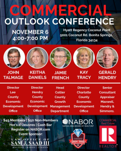 Kay Tracy represented Charlotte County Economic Development at the NABOR Commercial Outlook Conference. The EDO participated in an event focused on collaboration, professional development, and regional growth. The gathering brought together professionals to share insights on market trends and community development. Strong relationships within the real estate and economic development community help support informed growth across the county.