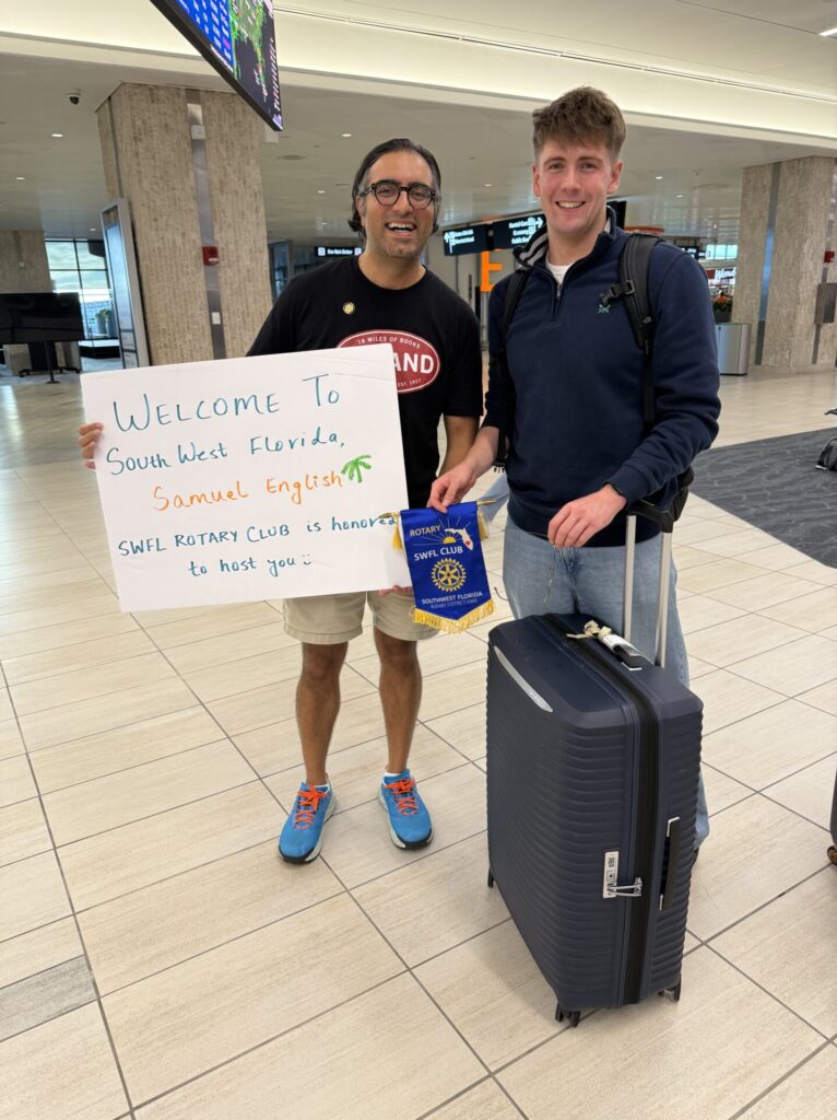 From the moment Samuel landed at Southwest Florida International Airport, he felt the warmth of Rotary’s welcome. Volunteers greeted him with smiles, a handmade sign, and the signature Rotary banner.